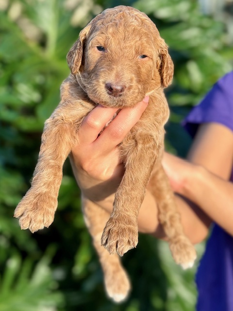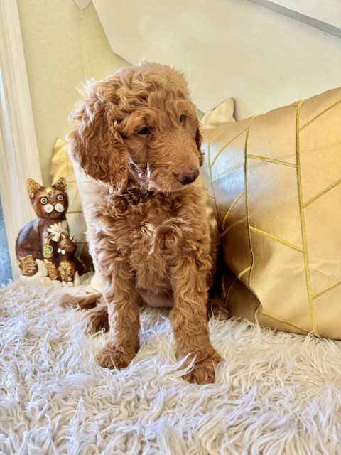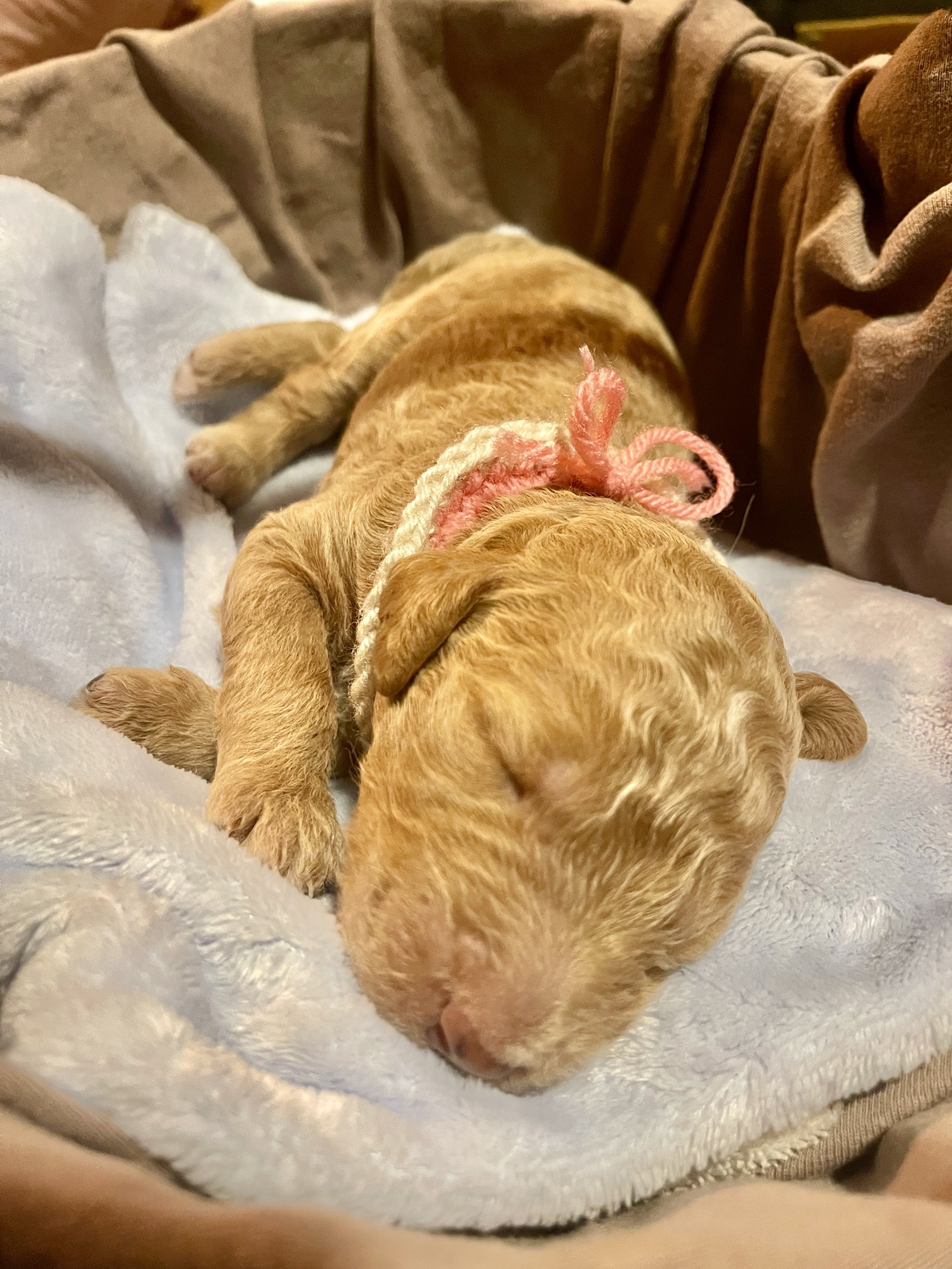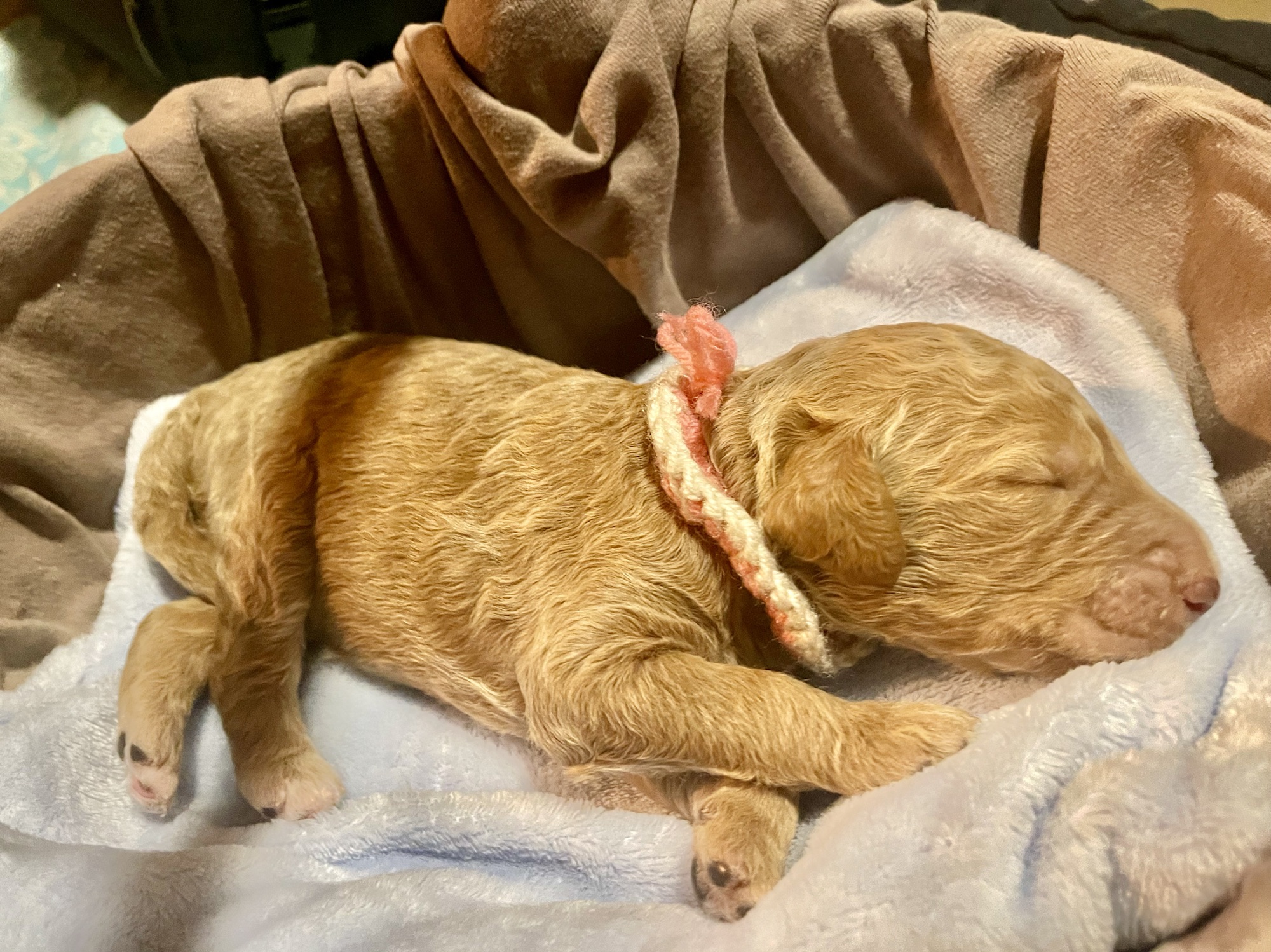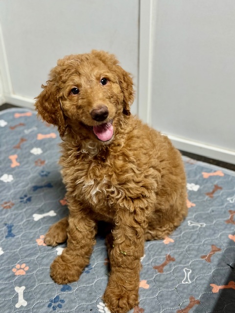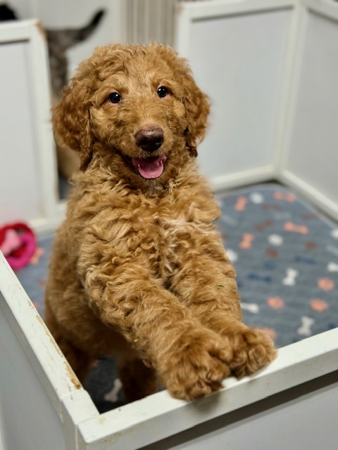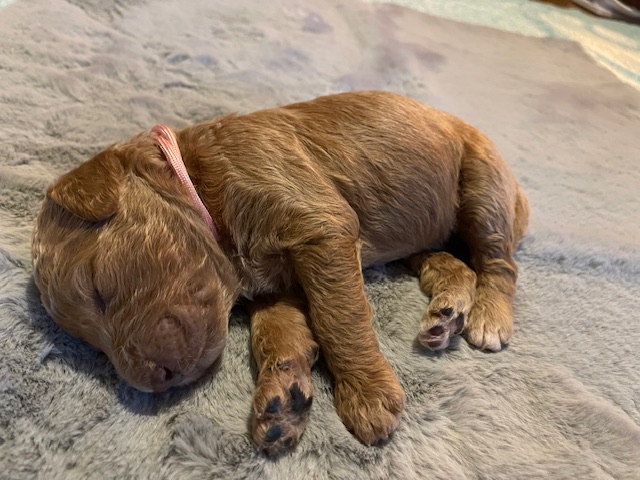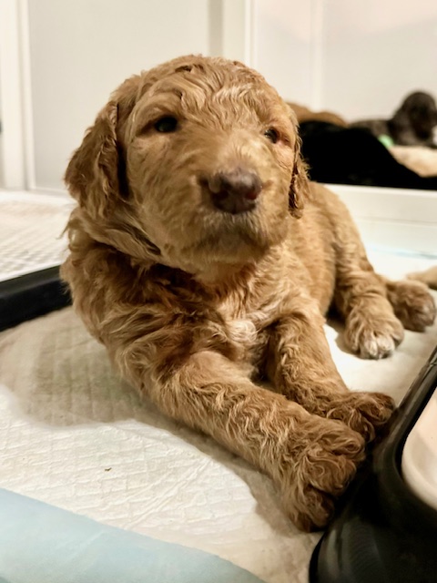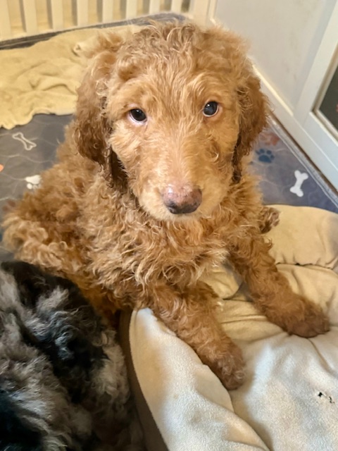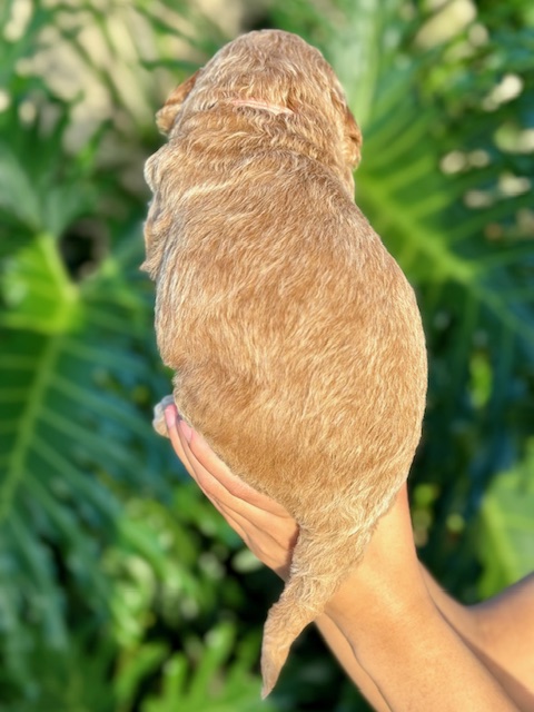 The last of the litter, a female puppy with an apricot (cream tips?) coat. The coat is quite wavy, thinking she’ll have a very curly adult coat.