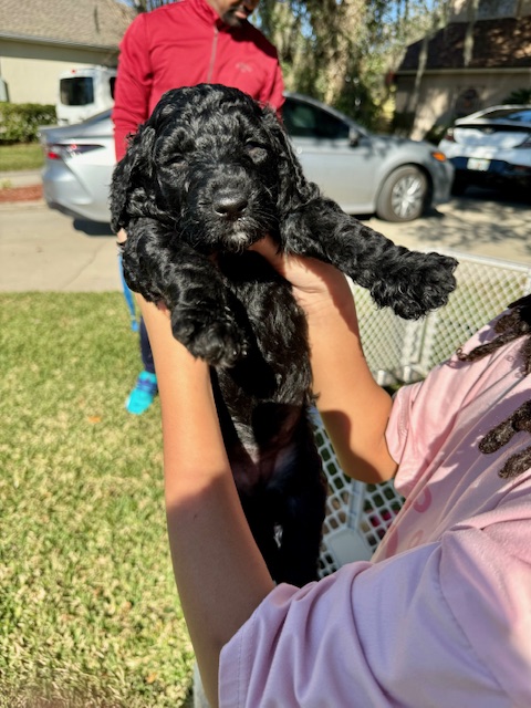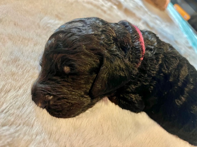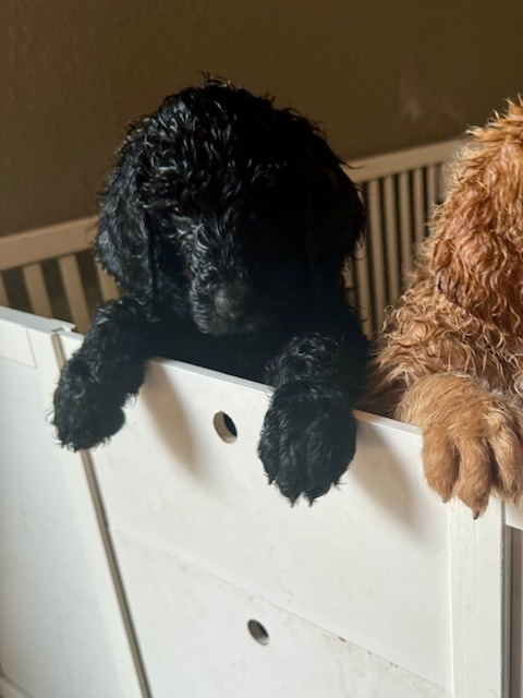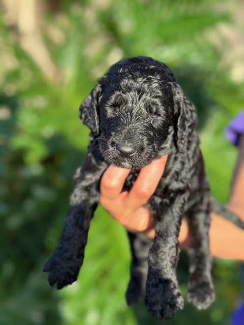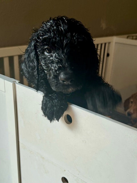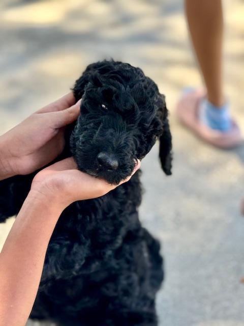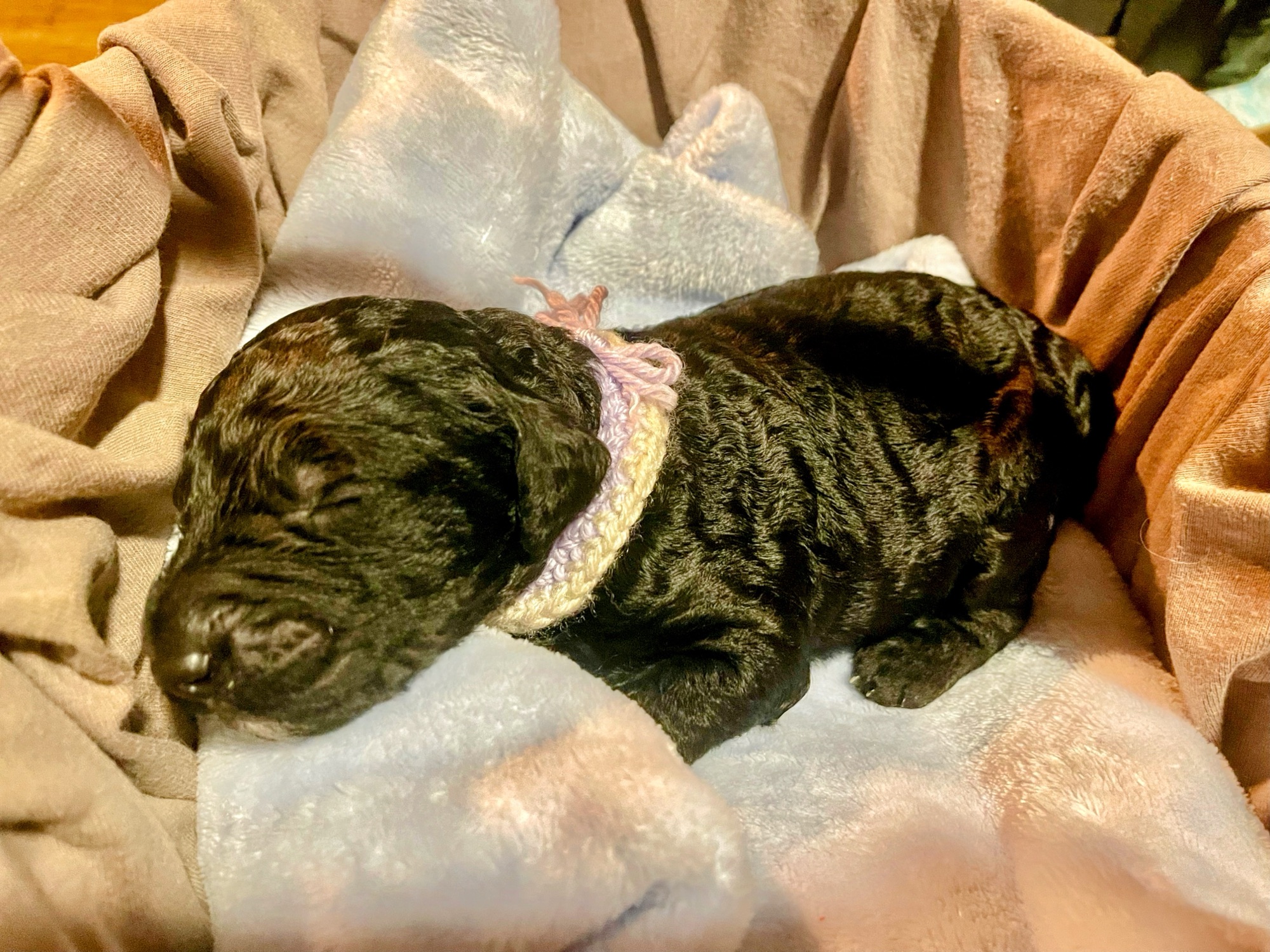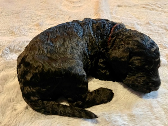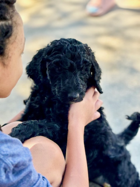 The smallest of the litter is our solid black female puppy. She is feisty and very vocal so far.