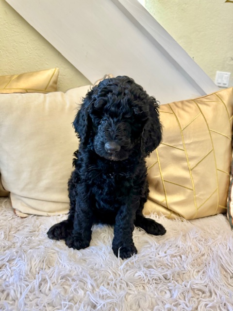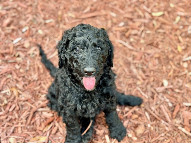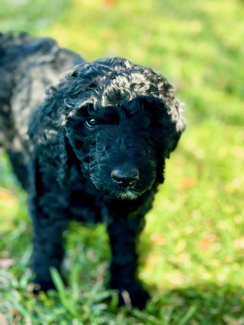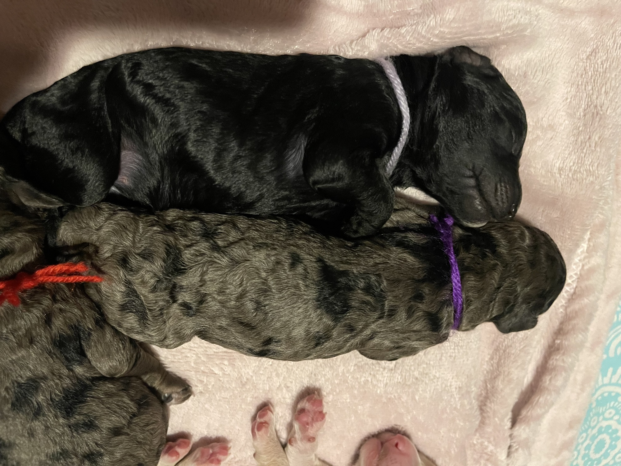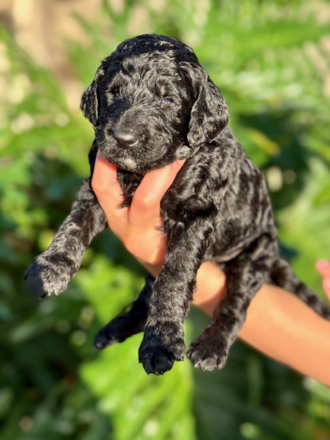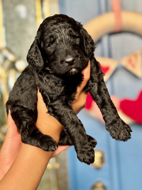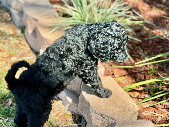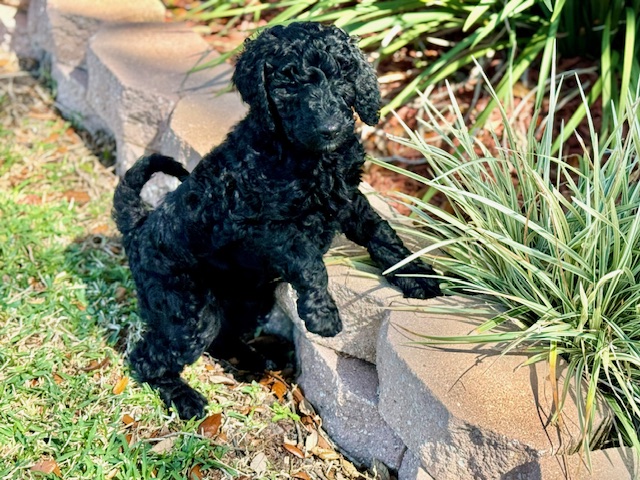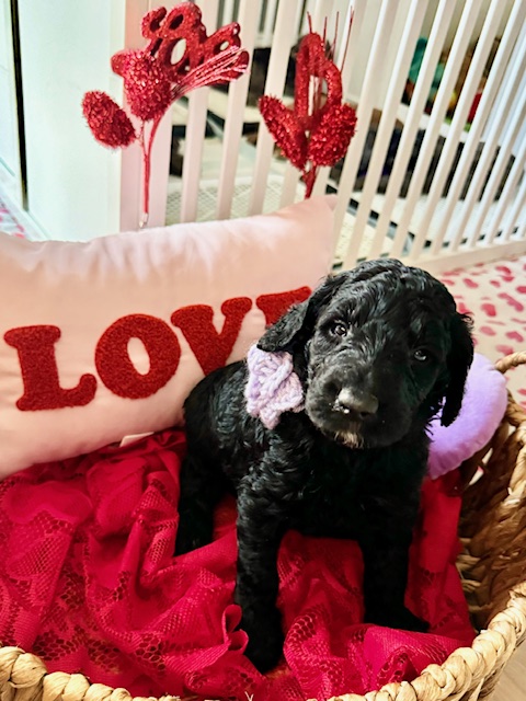 The smallest of the litter is our solid black female puppy. She is feisty and very vocal so far.