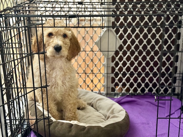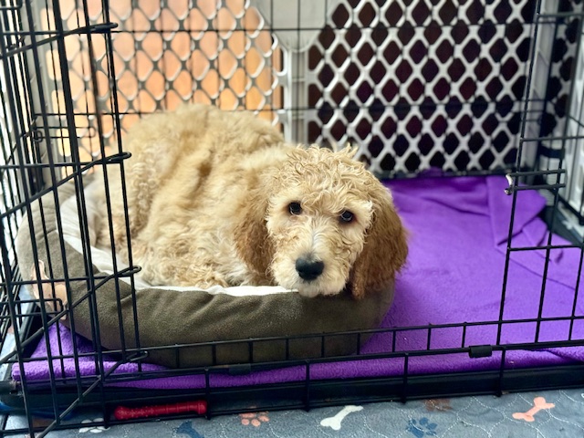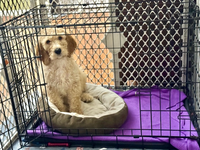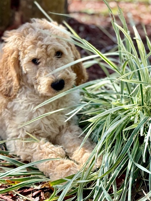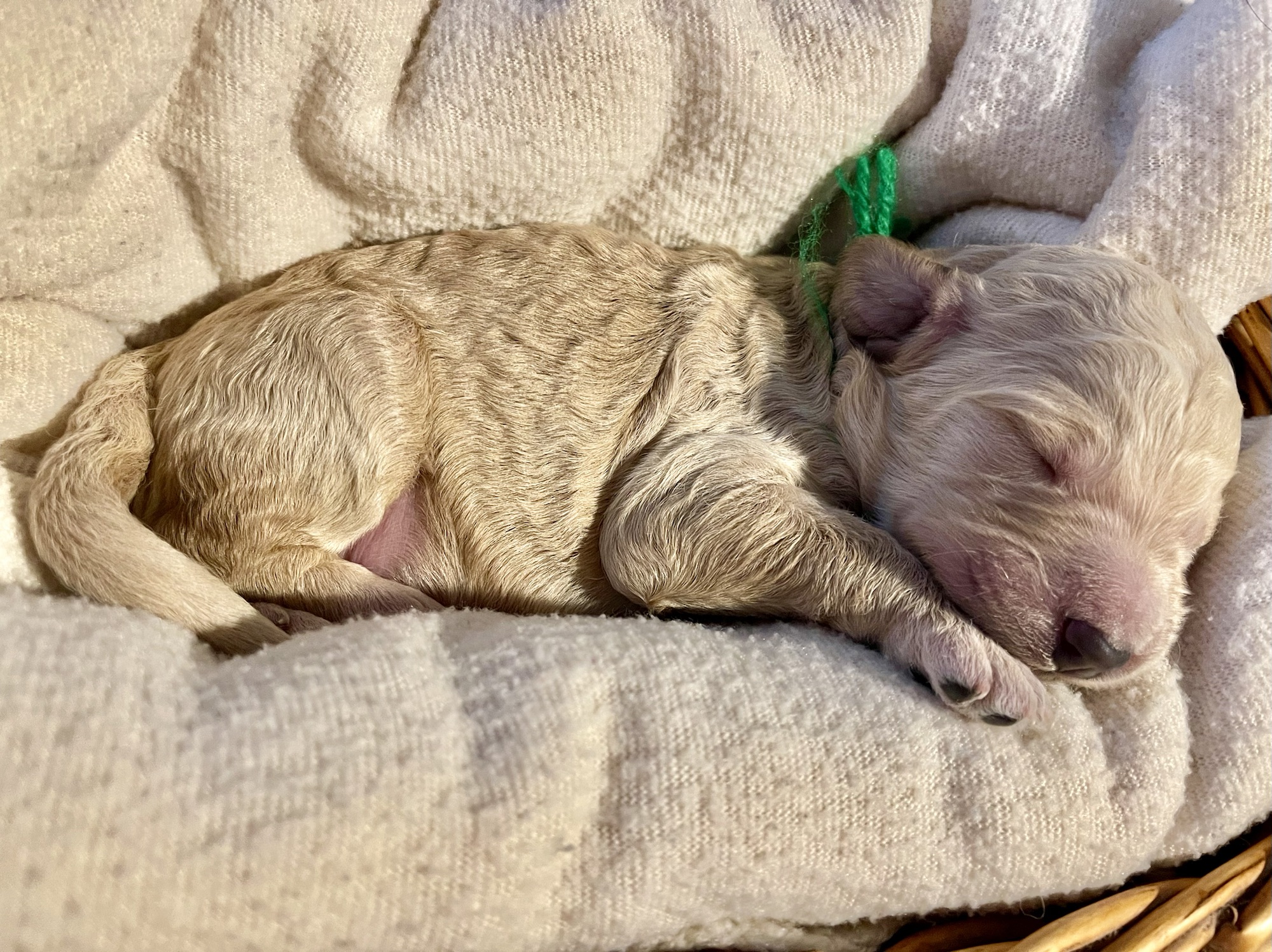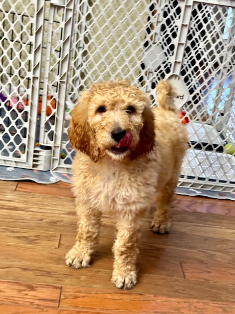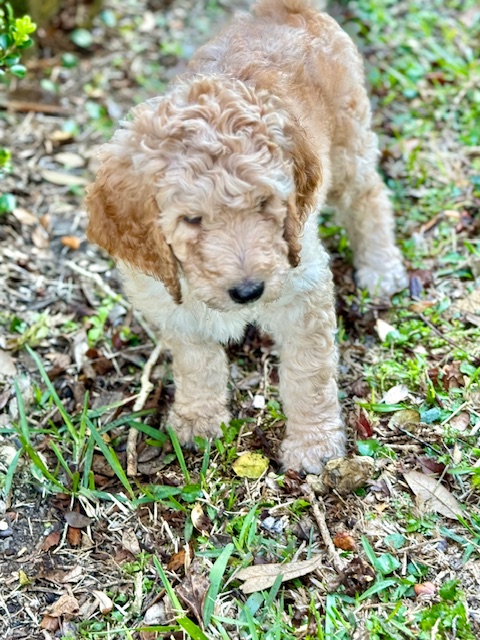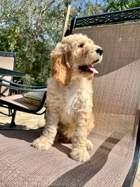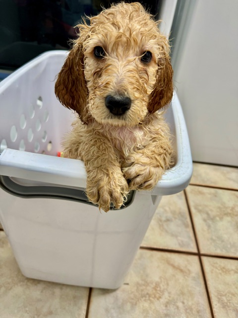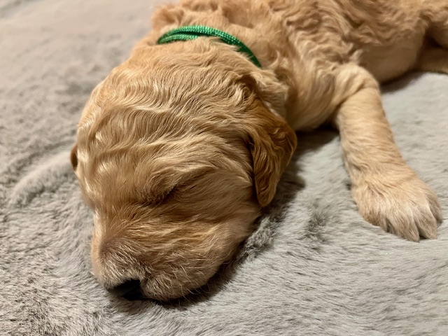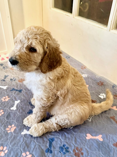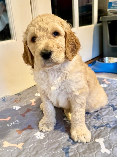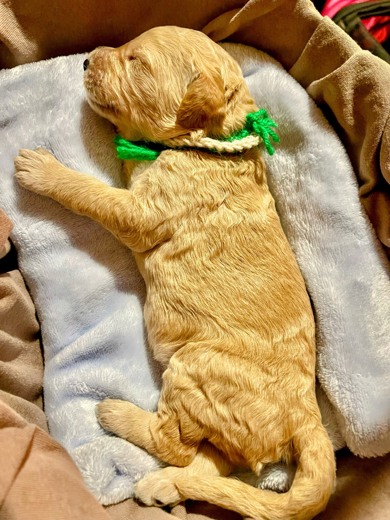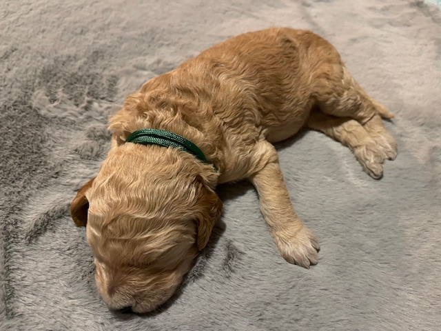 Mr. Apollo is such a perfect little puppy! He is looking like the classic Goldendoodle pup, and is such a fun guy! He eats well, plays hard, and has a habit of sneaking away to the potty trays for naptime. Even when I pick him up to place him on a comfy spot with his littermates, he goes right back to the tray. Silly boy!