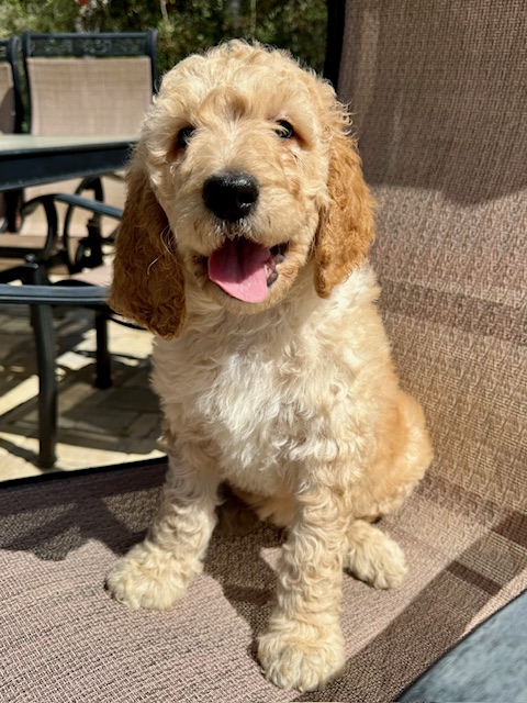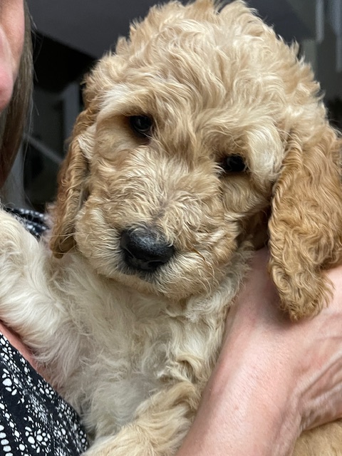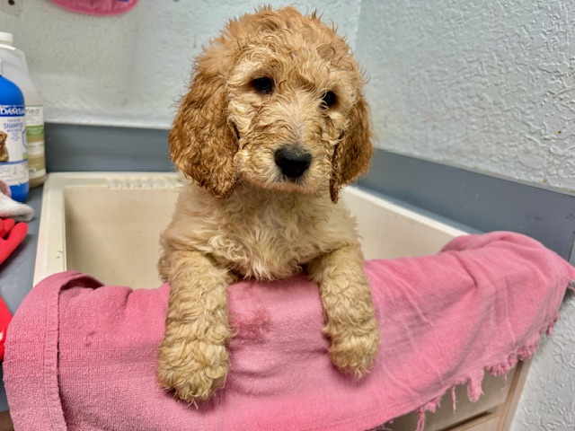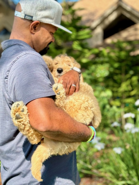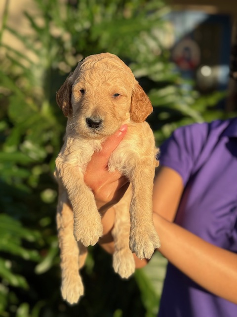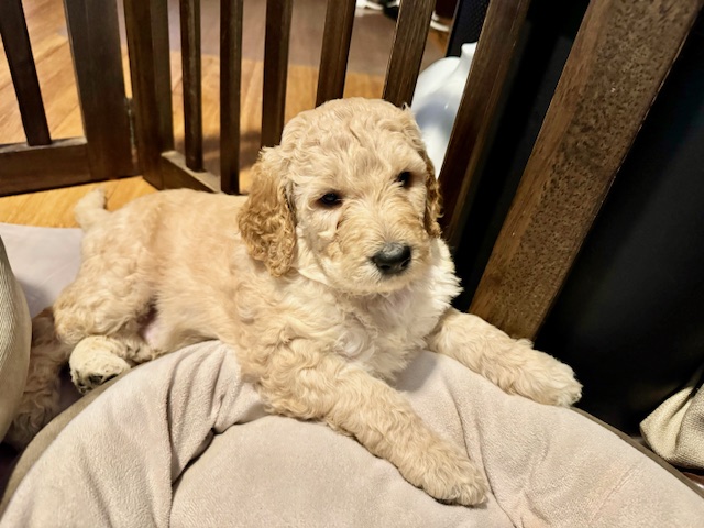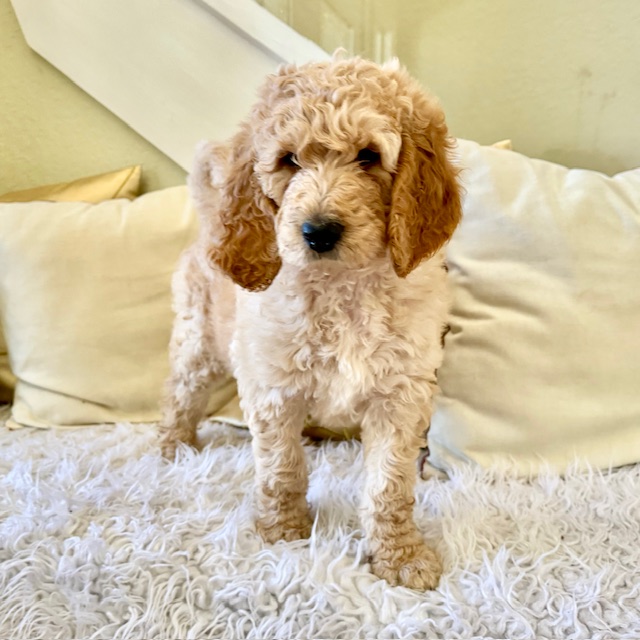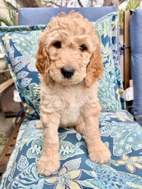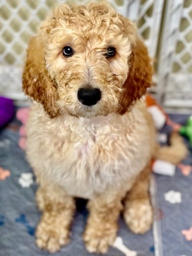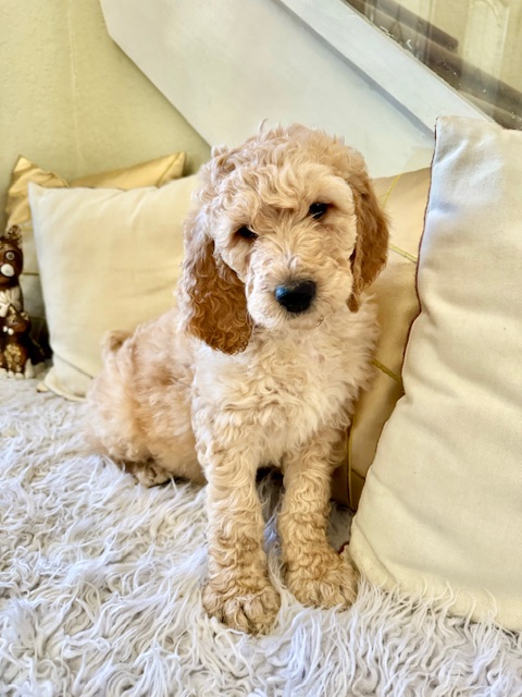 We have received so many inquiries for Apollo, but he still remains available. I just can’t believe no one has snatched up this cutie yet! He’s absolutely perfect in every way for a Goldendoodle puppy. He’s a cuddle bug, super smart, and is the biggest pup of the bunch. He has a beautiful temperament to match his great looks.