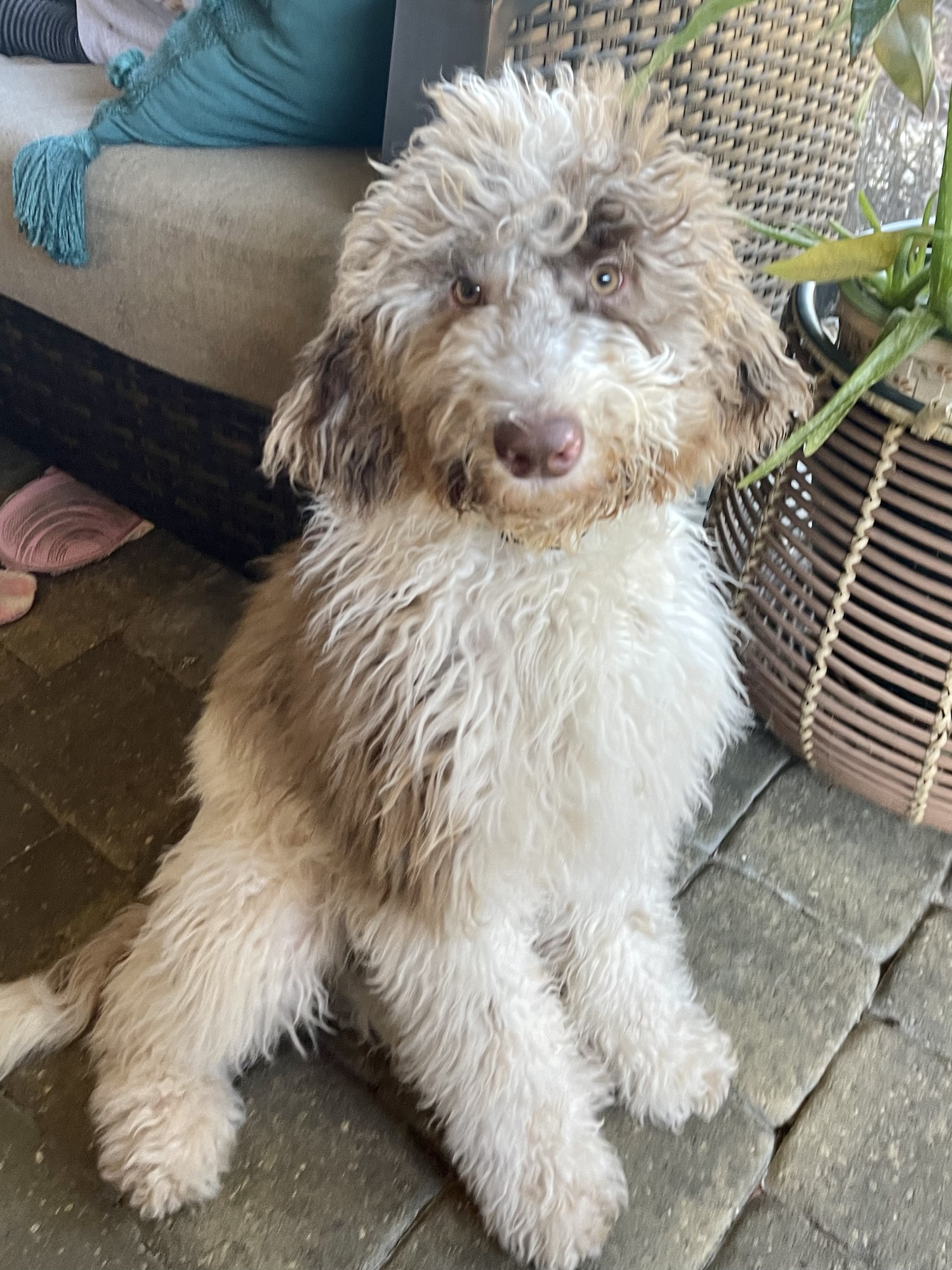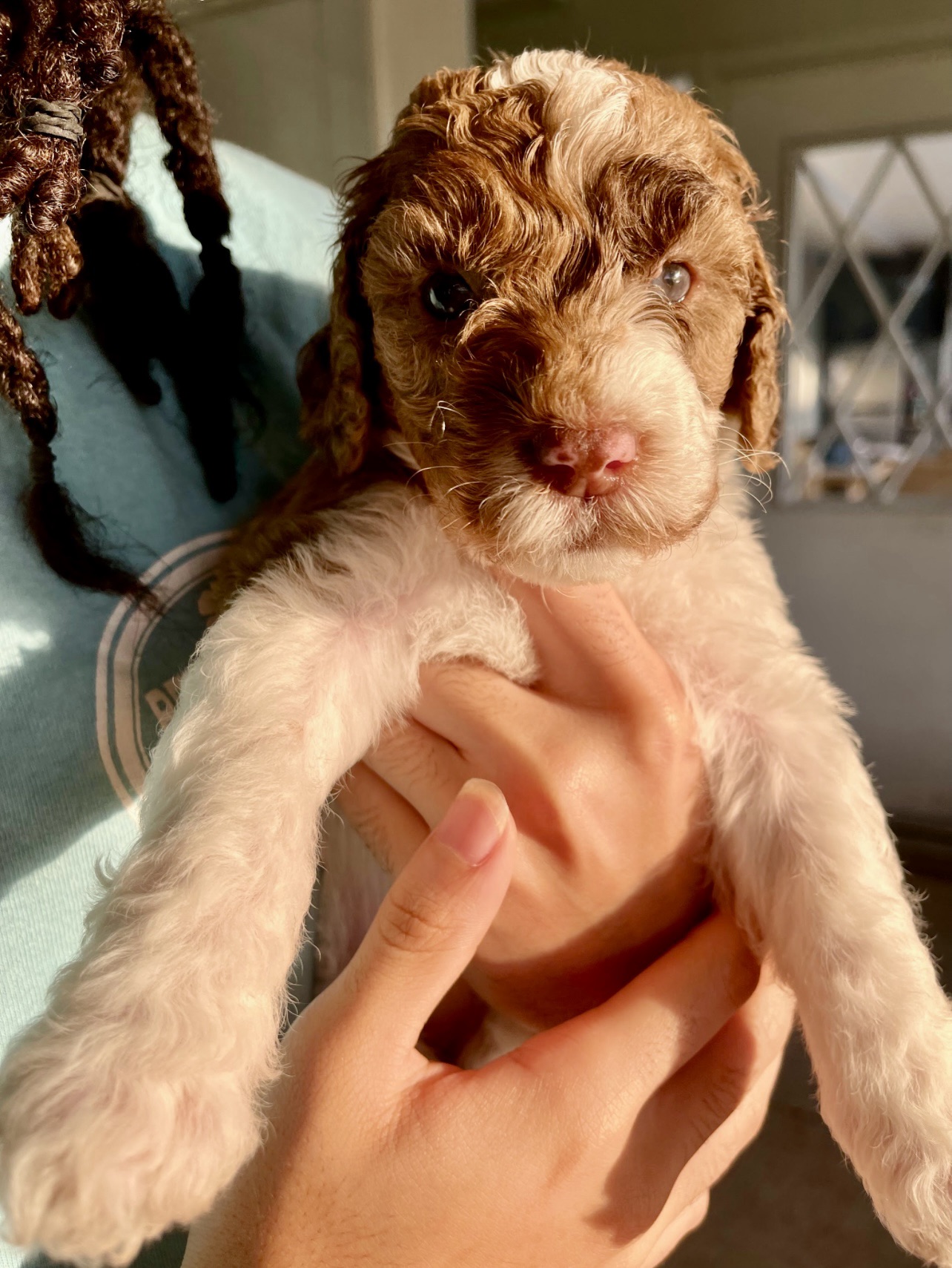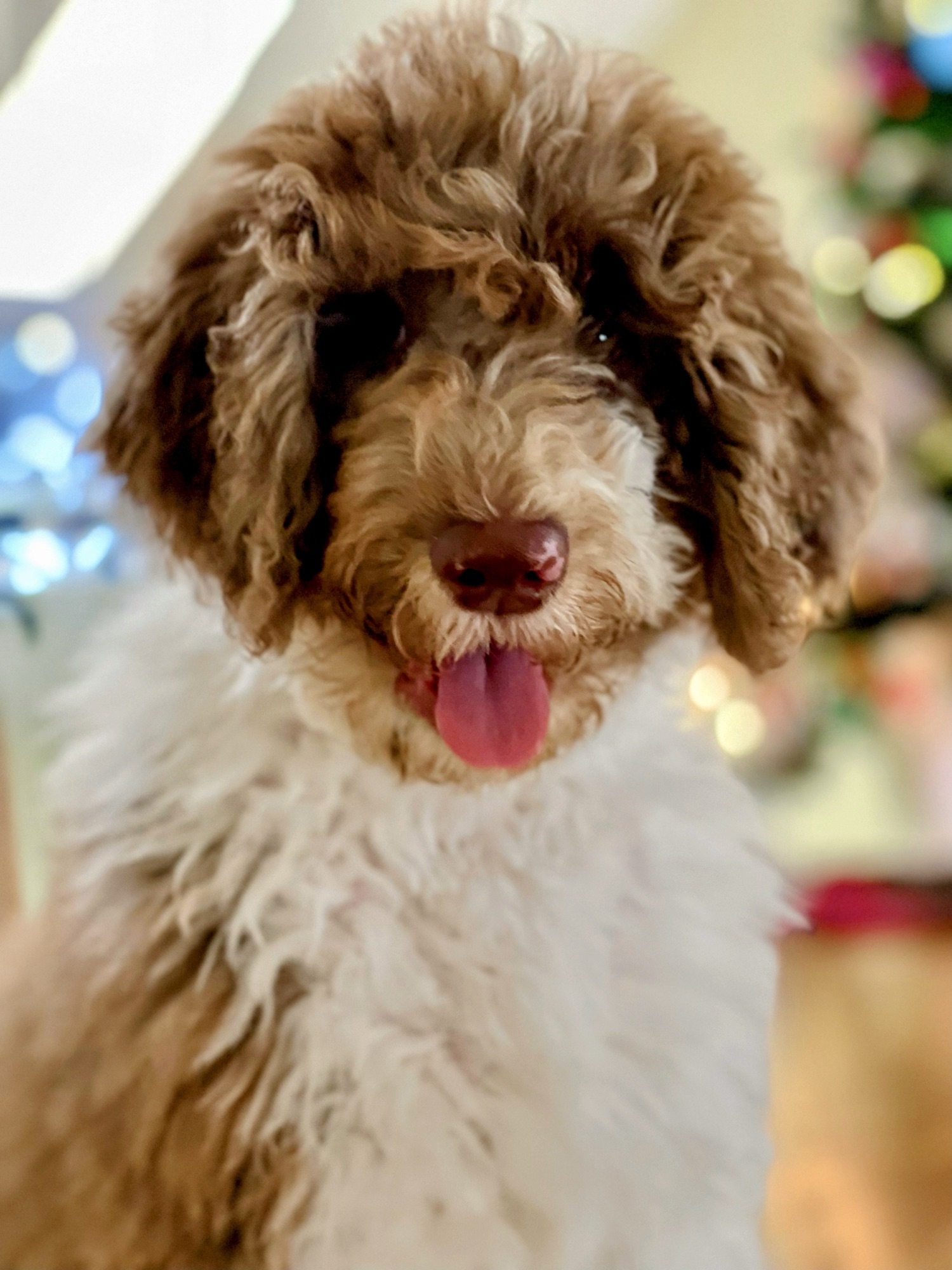 Darling’s mom is a black and white Poodle and her dad is a black and gray merle F1 Goldendoodle. Darling is a chocolate parti merle F1B Goldendoodle. She came from an absolutely stunning litter. She truly lives up to her name, and is a sweet and playful princess. She has always had amazing eyes, and her coat is soft with medium curls.