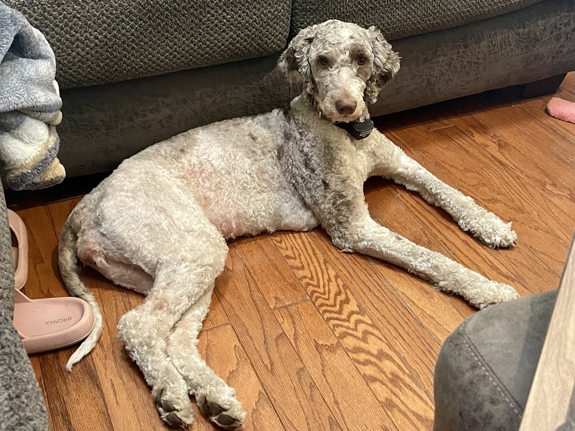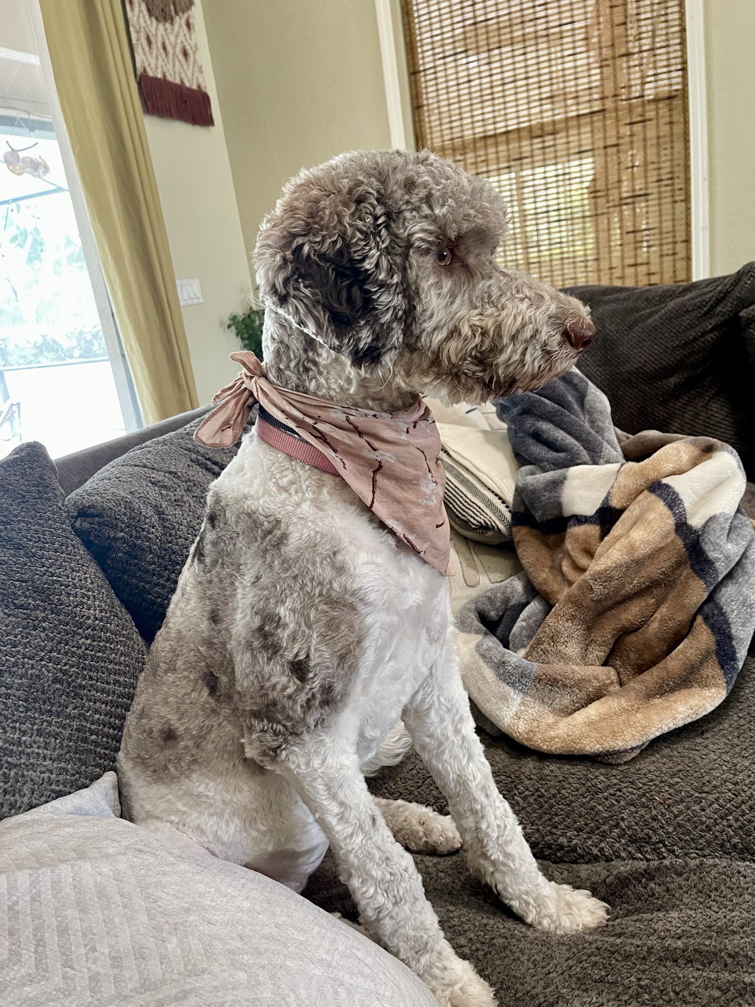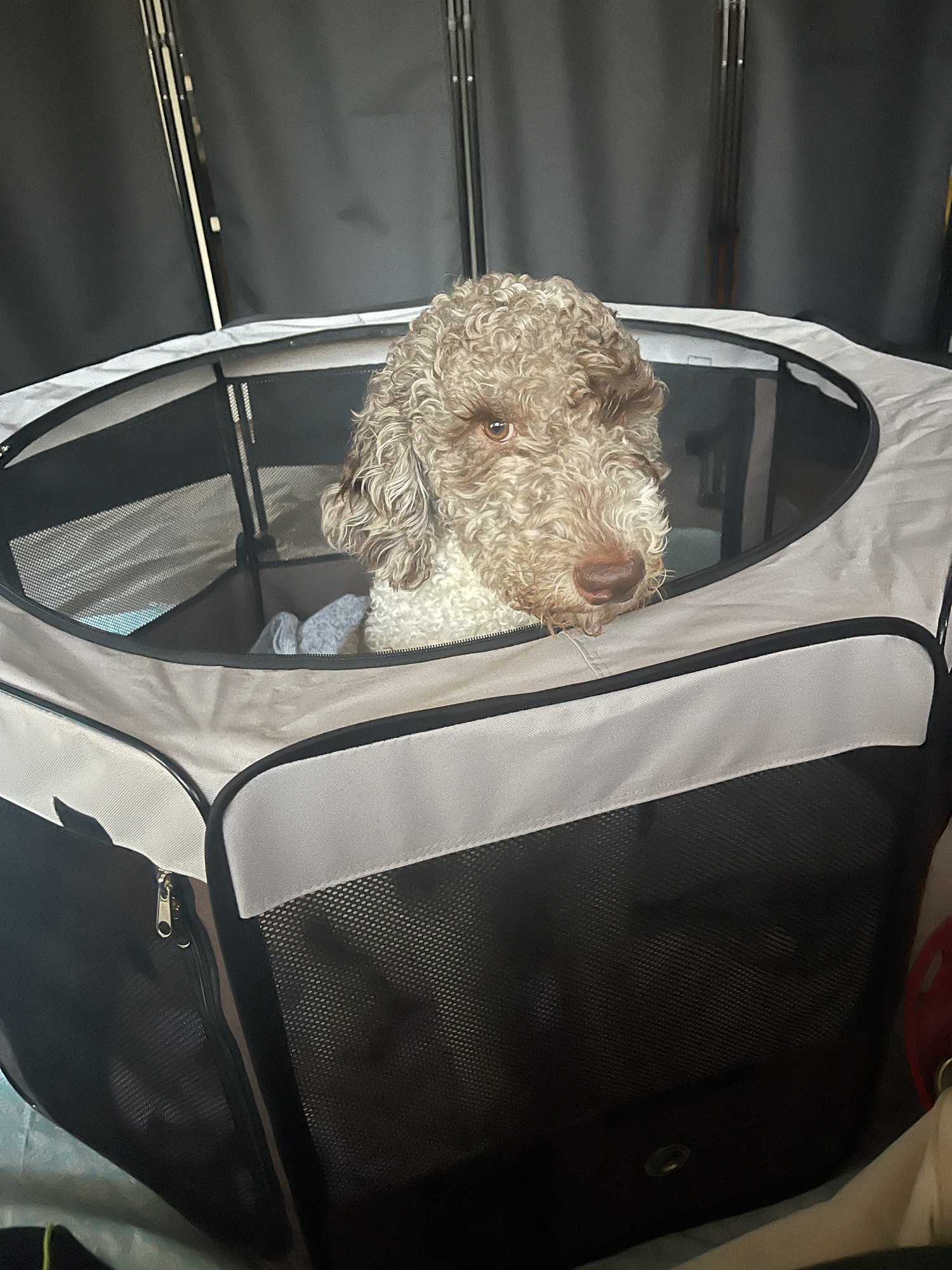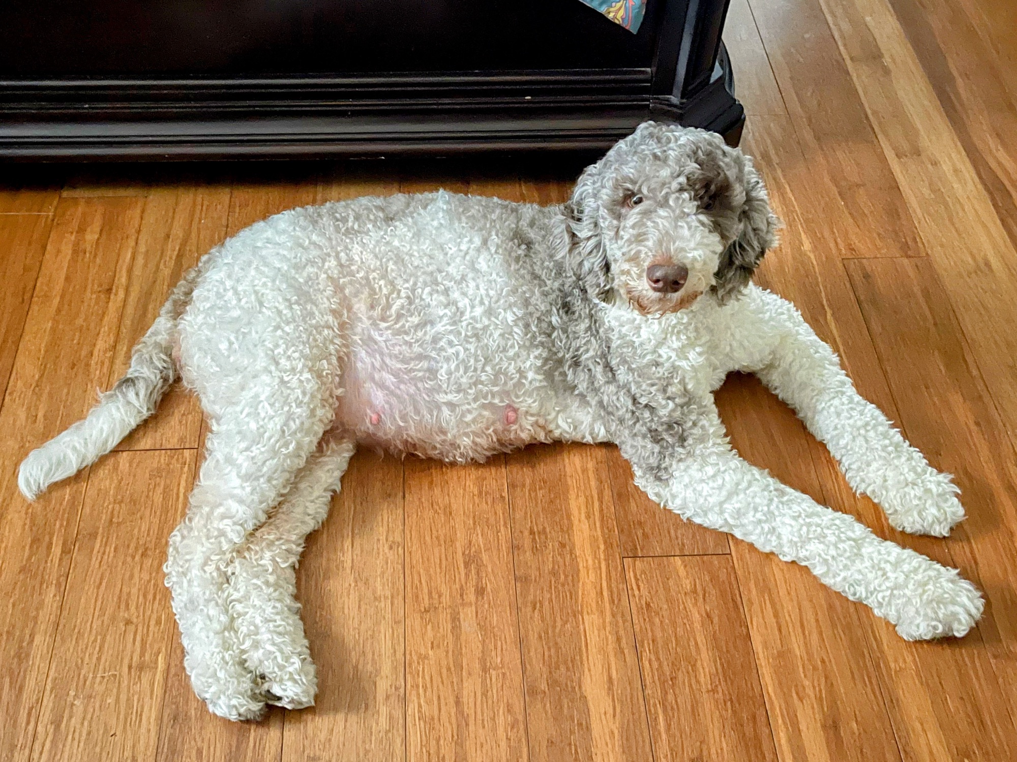 Darling’s mom is a black and white Poodle and her dad is a black and gray merle F1 Goldendoodle. Darling is a chocolate parti merle F1B Goldendoodle. She came from an absolutely stunning litter. She truly lives up to her name, and is a sweet and playful princess. She has always had amazing eyes, and her coat is soft with medium curls.