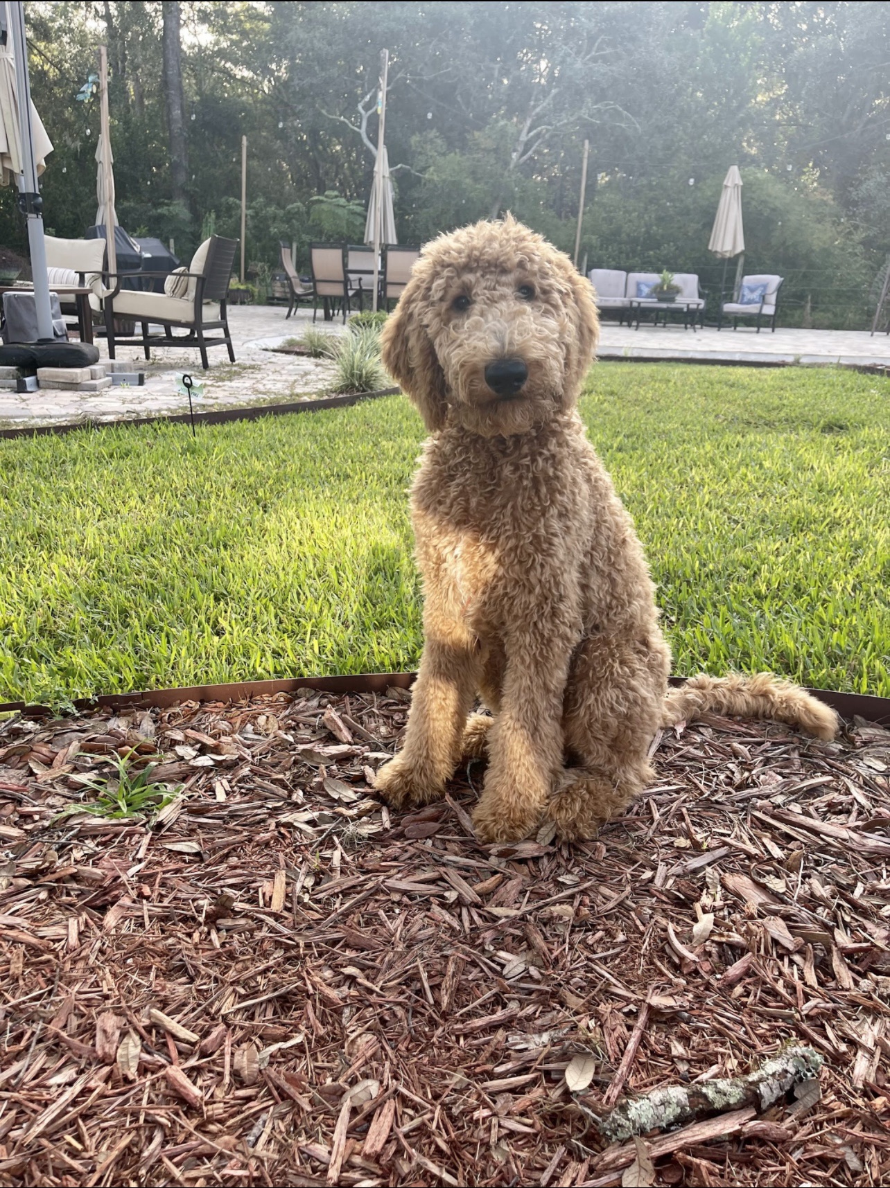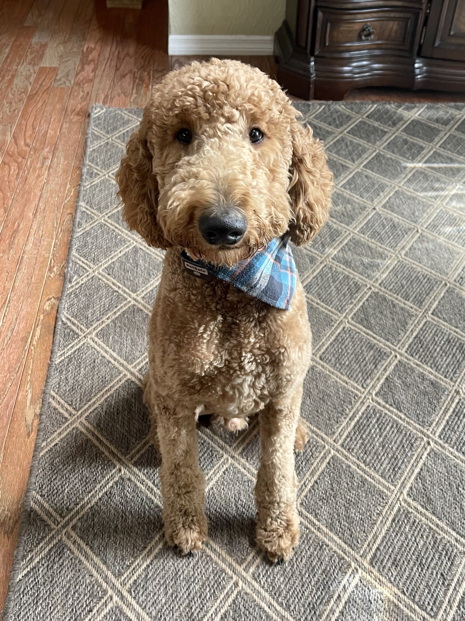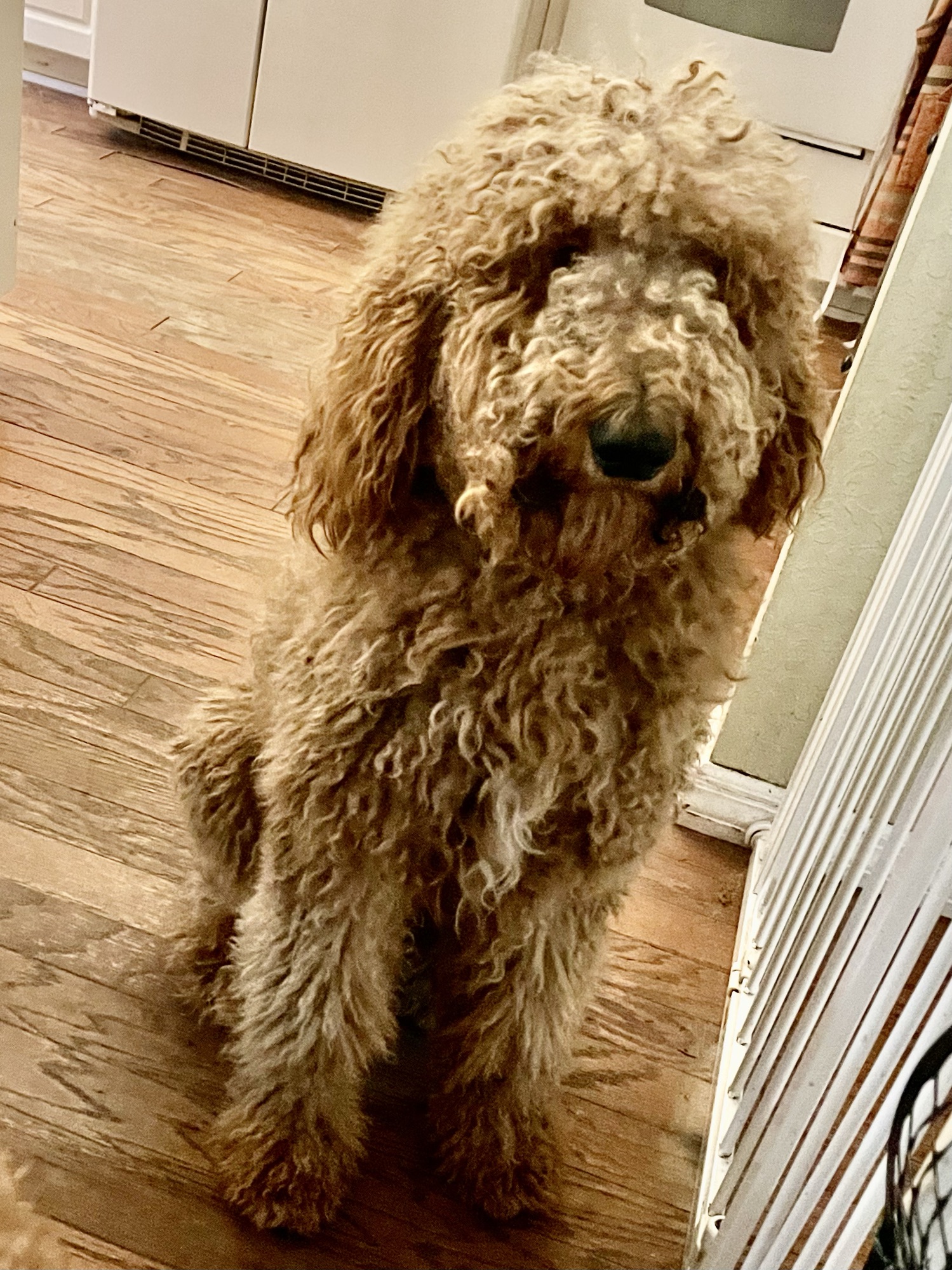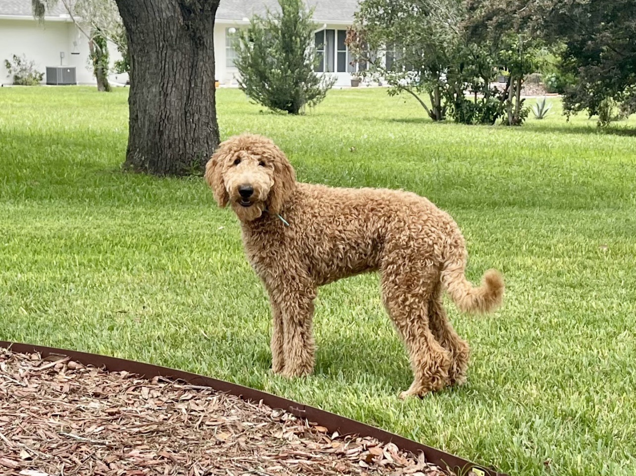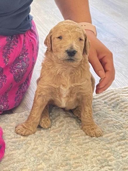 Ziggy’s dad is a gorgeous black poodle (Thor) and his mom is a beautiful F1 Goldendoodle (Honey). Ziggy is a cream F1B Goldendoodle and came from a beautiful litter. As a puppy, Ziggy was already quite vocal and very smart. He has always been a big handsome guy. At 6 weeks his coat was cream with a little white mark on his chest. As an adult, he still has a golden cream coat and his white mark blends in nicely.