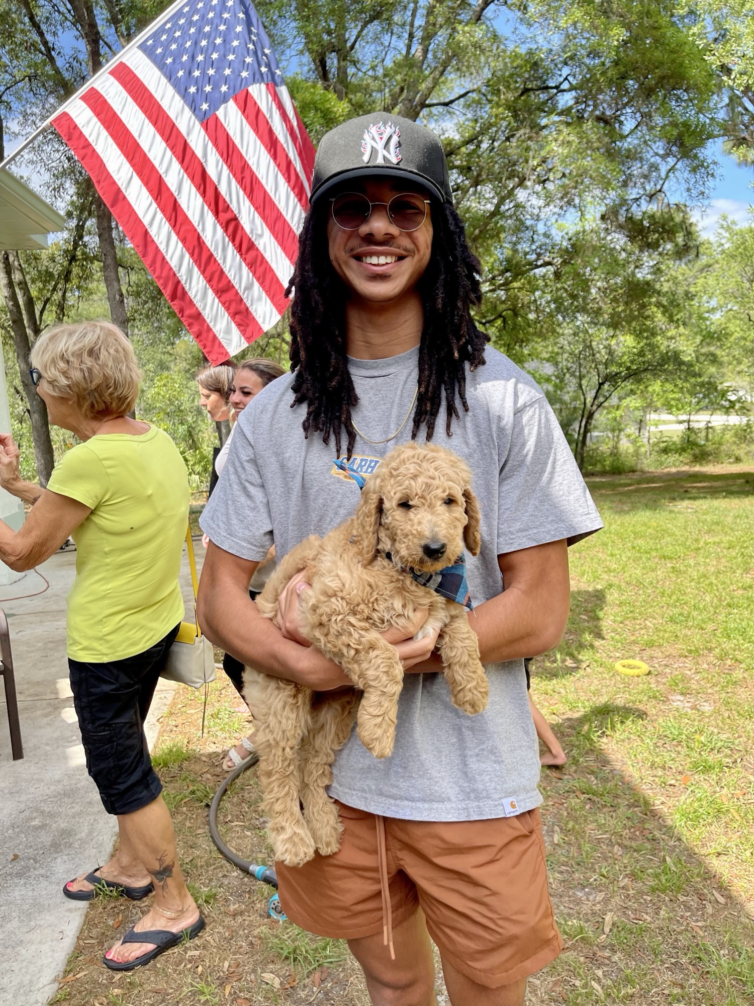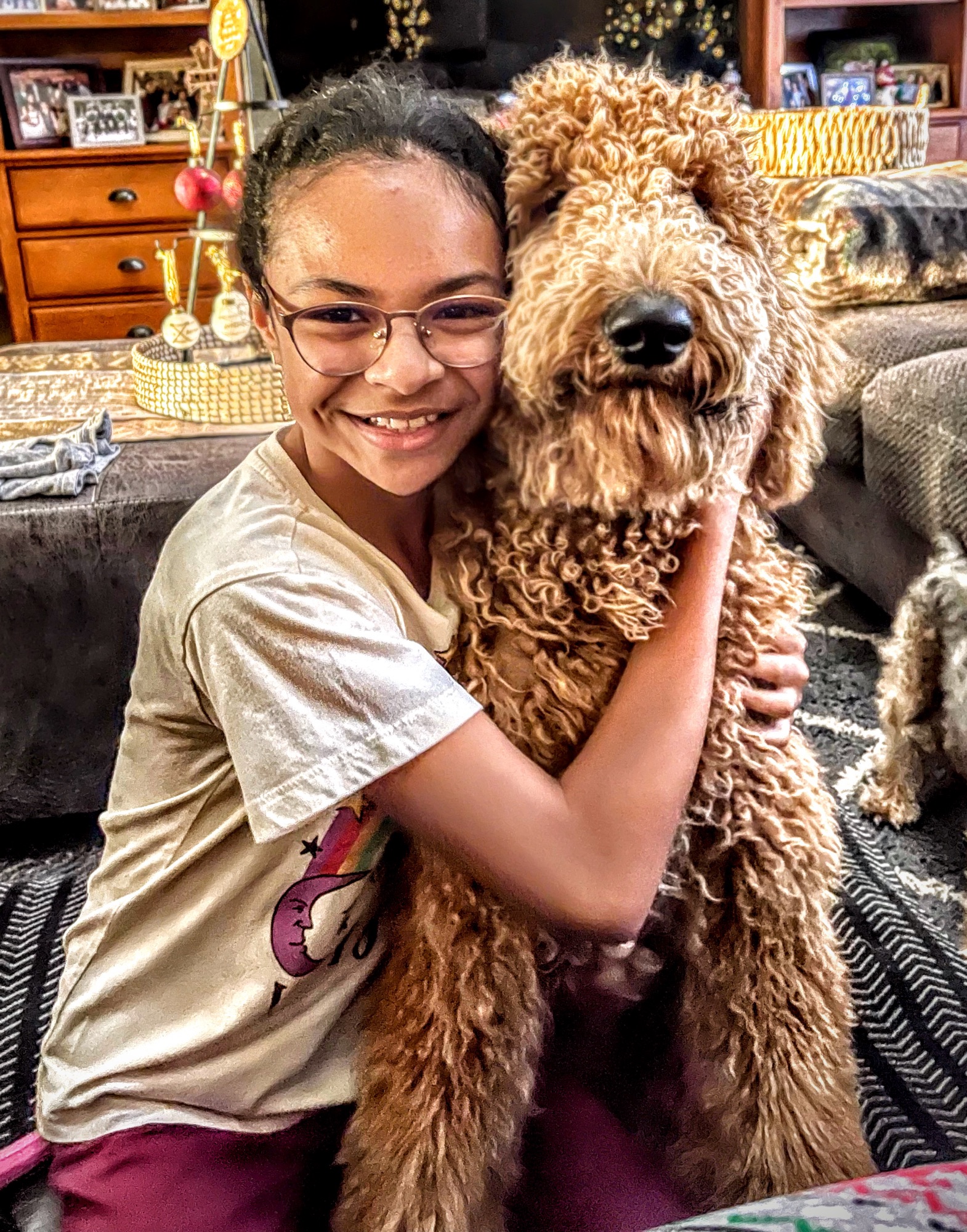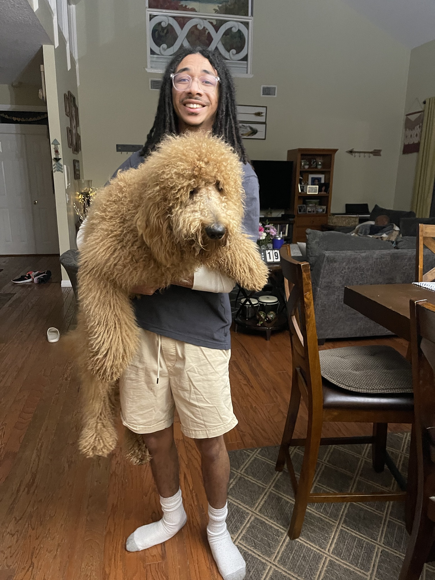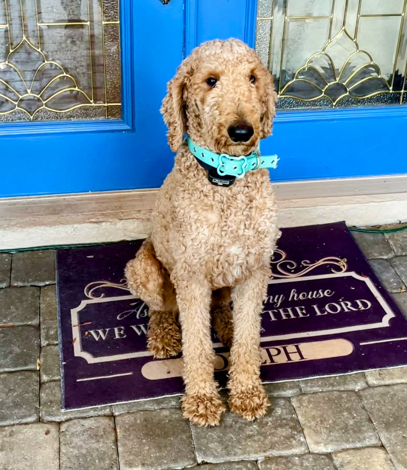 Ziggy’s dad is a gorgeous black poodle (Thor) and his mom is a beautiful F1 Goldendoodle (Honey). Ziggy is a cream F1B Goldendoodle and came from a beautiful litter. As a puppy, Ziggy was already quite vocal and very smart. He has always been a big handsome guy. At 6 weeks his coat was cream with a little white mark on his chest. As an adult, he still has a golden cream coat and his white mark blends in nicely.